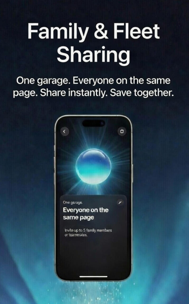 One garage. Everyone on the same page. Invite up to 5 family members or teammates and instantly share every vehicle’s fuel logs, service history, costs, and AI insights in real time.
