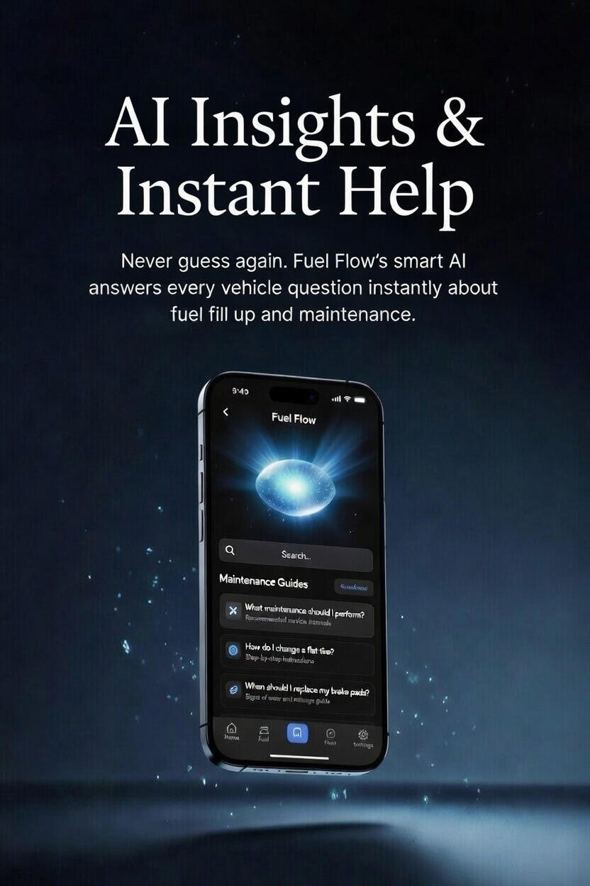 Never guess again. Fuel Flow’s intelligent AI instantly answers every question about your vehicle: step-by-step how-tos for oil changes, tire rotations and more; instant troubleshooting for low MPG, strange noises or warning lights; personalized fuel-fill insights showing exactly where you can save money next tank; and smart maintenance predictions with weather-aware tips.