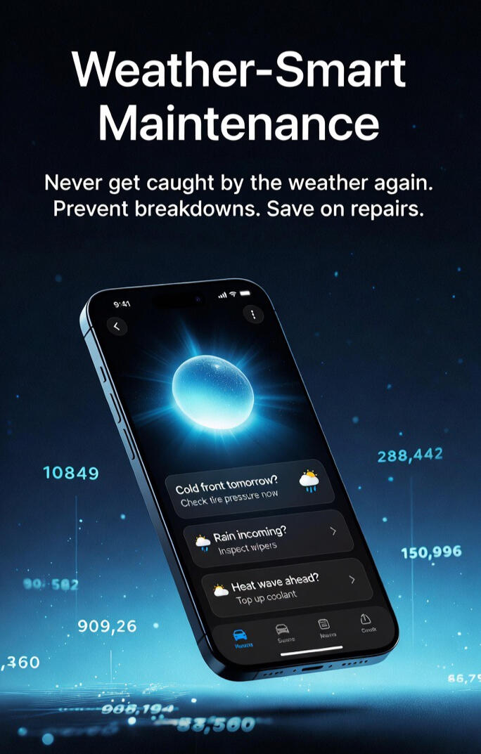 Never get caught by the weather again. Fuel Flow automatically reads local forecasts and your vehicle data to deliver precise, timely tips: “Cold front tomorrow? Check tire pressure now”, “Rain incoming? Inspect wipers”, “Heat wave ahead? Top up coolant”.